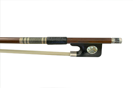 Finest select Pernambuco with an Abalone Oval eye. A beautifully large Abalone Oval eye greatly enhances this wonderfully balanced bow. It has all the other features of a Hermann Luger Master bow, such as a fully silver-lined ebony frog, beautiful pearl slide, inlaid silver mounting, and pearl inlaid three-part screw. Exceptional handwork, detail, and playability. A very fine bow at an even finer price.
